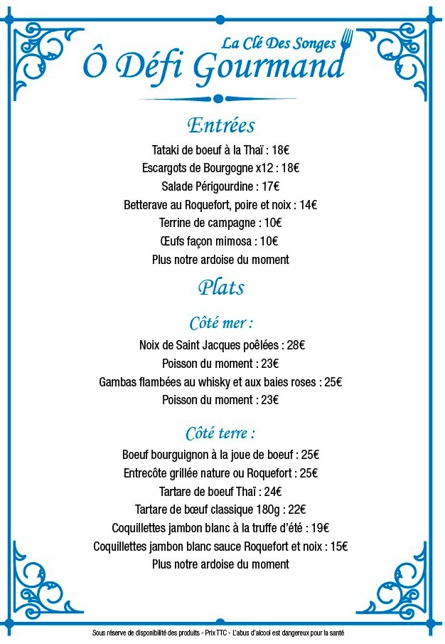 Tous nos plats sont cuisinés sur place avec des produits frais, viandes et poissons français de préférence.